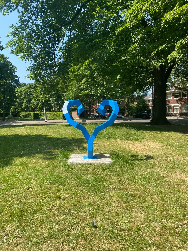 - Terug naar dat blauwe beeld. Het gebroken hart vond ik niet onaannemelijk, maar ik bij moderne kunst mag je zelf ook gissen. Ik koos er voor om dit beeld te zien als twee zielen, ontsproten uit de aarde, die het alleen probeerden, wilden leren, de weg kwijtraakten en mekaar weer aan wilden raken om zo congruent te worden. Maar ik ben een optimist.