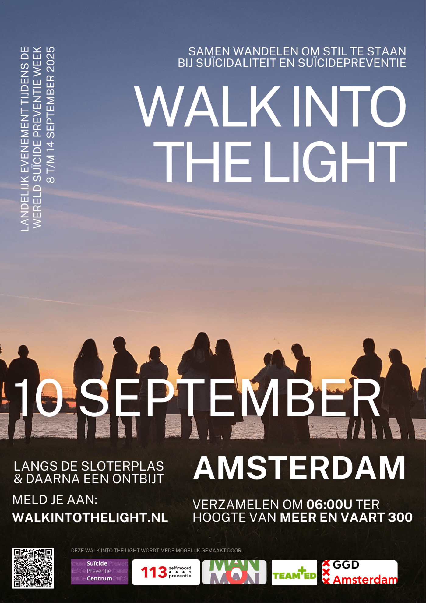 Walk into the Light is een landelijk evenement dat jaarlijks plaatsvindt tijdens de Wereld Suïcide Preventie Week in september. In alle vroegte wandelen mensen op tientallen locaties in Nederland samen richting de zonsopkomst. Een symbolisch en verbindend moment, waarin we stilstaan bij de impact van suïcidaliteit en het belang van aandacht, steun en preventie.